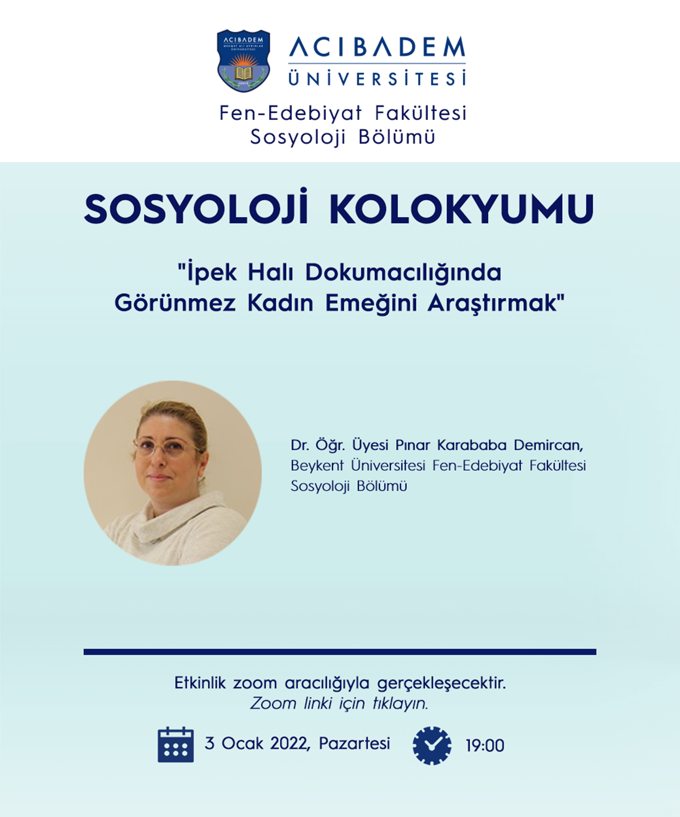 Fen Edebiyat Fakültesi Sosyoloji Bölümü’nün düzenlediği 2022 yılındaki ilk kolokyum, 3 Ocak tarihinde çevrim içi olarak gerçekleşti. Öğretim üyeleri, lisans ve lisansüstü öğrencilerin katılımıyla gerçekleşen kolokyumda Beykent Üniversitesi Fen-Edebiyat Fakültesi İngilizce Sosyoloji Bölümü’nden Dr. Öğr. Üyesi Pınar Karababa Demircan konuşmacı olarak ağırlandı.