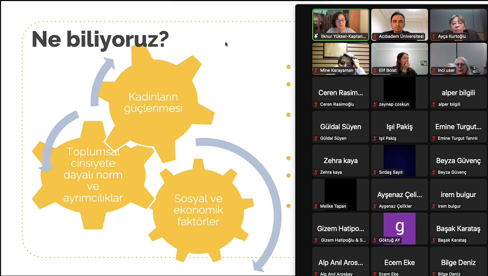 İnsan ve Toplum Bilimleri Fakültesi Sosyoloji Bölümümüzün 2022-2023 akademik yılında düzenlediği ikinci kolokyum, 16 Kasım tarihinde 75 öğrencinin ve öğretim üyelerinin katılımıyla çevrim içi olarak gerçekleşti. “25 Kasım Kadına Yönelik Şiddete Karşı Uluslararası Mücadele Günü” bağlamında düzenlenen toplantıda konuşmacı olarak yer alan Hacettepe Üniversitesi Nüfus Etütleri Enstitüsü’nden demograf Doç. Dr. İlknur Yüksel Kaptanoğlu “Kadına Yönelik Şiddete Karşı Mücadelenin Neresindeyiz?” başlıklı konuşmasına, HÜNEE tarafından yapılmış olan Kadına Yönelik Şiddet araştırmaları ile günün anlam ve önemi hakkında bilgi vererek başladı.