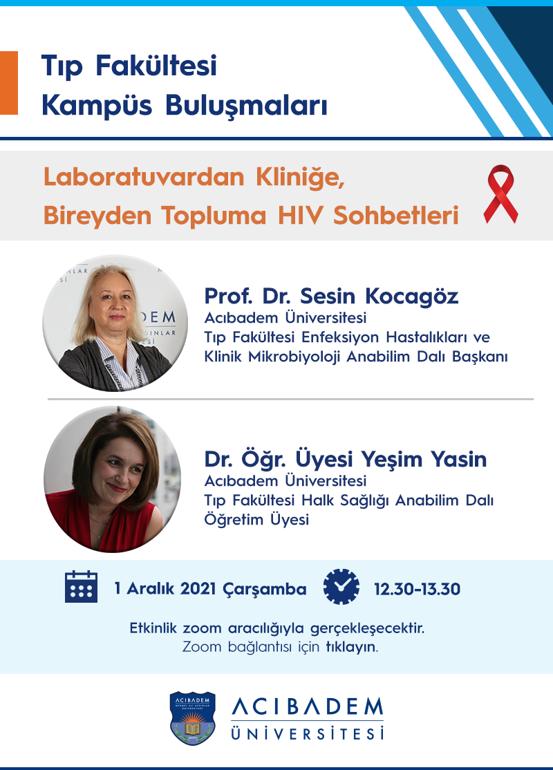 Tıp Fakültemizin düzenlediği Kampüs Buluşmaları Aralık ayında da önemli konuşmacıları ağırladı. Üniversitemiz Tıp Fakültesi Enfeksiyon Hastalıkları Anabilim Dalı Başkanı Prof. Dr. Sesin Kocagöz ve Tıp Fakültesi Halk Sağlığı Anabilim Dalı Öğretim Üyesi Dr. Öğr. Üyesi Yeşim Yasin’in konuşmacı olarak yer aldığı “Laboratuvardan Kliniğe, Bireyden Topluma HIV Sohbetleri” başlıklı etkinlik Dünya AIDS Günü’nde 1 Aralık 2021 tarihinde çevrim içi olarak gerçekleşti.