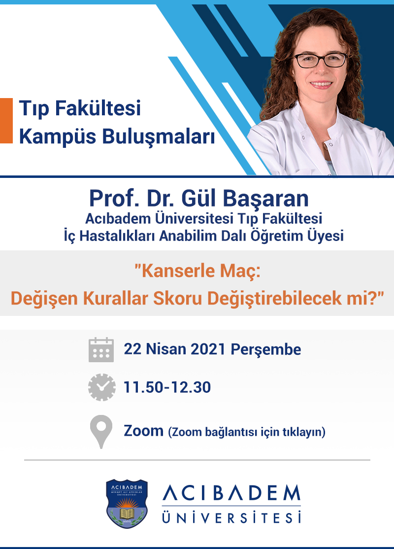 Tıp Fakültemizin her ay rutin olarak düzenlediği Kampüs Buluşmaları Nisan ayında da önemli konuşmacıları ağırladı.“Kanserle Maç: Değişen Kurallar Skoru Değiştirebilecek mi?”Tıp Fakültesi İç Hastalıkları Anabilim Dalı Öğretim Üyemiz Prof. Dr. Prof. Dr. Gül Başaran’ın konuk olduğu etkinlik 22 Nisan 2021 tarihinde çevrim içi olarak gerçekleşti. “Hayat Gezintileri”Tıp Fakültesi Eski Dekanımız ve Acıbadem Üniversitesi Maslak Hastanesi Kulak Burun Boğaz Hastalıkları Uzmanı Prof. Dr. Hasan M. Tanyeri’nin konuk olduğu etkinlik 29 Nisan 2021 tarihinde çevrim içi olarak gerçekleşti. {{ partial:custom-gallery folder="haberler/2021/nisan/kampus-bulusmalari-nisan/290421" genislik="4"baslik="true" galeri="true" }