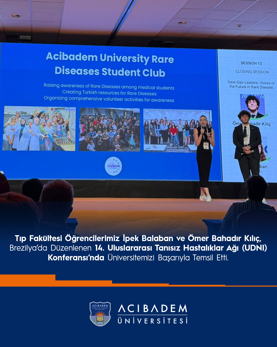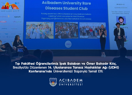 Bu yıl ilk kez Güney Yarımküre’de düzenlenen UDNI Konferansı, 28–31 Ekim 2025 tarihleri arasında Brezilya’nın Rio de Janeiro şehrinde gerçekleştirildi. Öğrencilerimiz İpek Balaban ve Ömer Bahadır Kılıç, “Yeni Nesil Liderler: Nadir Hastalıkta Geleceğin Sesleri” başlıklı sunumlarıyla, Üniversitemiz bünyesinde faaliyet gösteren Nadir Hastalıklar ve Yetim İlaçlar Uygulama ve Araştırma Merkezi (ACURARE)’nde yürütülen farkındalık, eğitim ve araştırma çalışmalarını ve öğrencilerin bu çalışmalardaki rolünü katılımcılarla paylaştılar.