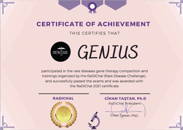 Bu yıl ikincisi düzenlenen, birçok üniversite ve fakülteden 39 takımın katılım gösterdiği, uluslararası genetik hastalıklar öğrenci yarışması olan 'Rare Disease Challenge (RaDiChal) 2021’ bünyesinde, Tıp Fakültesi Dönem III öğrencilerimiz Beril Ay, Efe Sarı, Seray Başak Bozkurt ve Yaren Nur Demir’in oluşturduğu Genius Takımı, hedef hastalıkları Ailevi Akdeniz Ateşi için gen terapisi protokolü geliştirerek altın madalya kazandı.Öğrencilerimizi kutlar, başarılarının devamını dileriz.