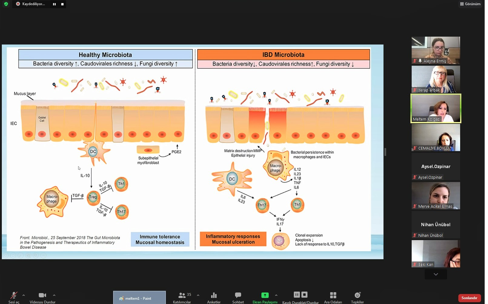 Tıp Fakültesi Temel Tıp Bilimleri Bölümü’nde süregelen bilimsel çalışmaları hem Tıp Fakültemizle hem de üniversitemizdeki araştırma merkezleri ile paylaşmak ve disiplinlerarası bilimsel iş birliğini sağlamak amacıyla gerçekleştirilen Tıp Fakültesi Temel Tıp Bilimleri Bölümü Bilimsel Toplantıları’nın beşincisi 27 Nisan 2022 tarihinde çevrim içi olarak gerçekleşti.Öğretim üyeleri, lisans ve lisansüstü öğrencilerin katılımıyla gerçekleşen toplantıda Tıp FakültesiFizyoloji Anabilim Dalı Başkanımız Doç. Dr. Meltem Kolgazi konuşmacı olarak ağırlandı. Doç. Dr. Kolgazi, “Inflamatuar Barsak Hastalığında Konak-Mikrobiyota Etkileşimleri” başlıklı sunumunda, yapmış olduğu bilimsel projeler bazında ınflamatuar barsak hastalığından bahsederek, deneysel ınflamatuar barsak hastalığı modellerinde mikrobiyotanın inflamasyona olan etkileri ve konak-mikrobiyota etkileşimleri hakkında katılımcıları bilgilendirdi.Araştırmalarını gastrointestinal inflamasyon, mikrobiyotanın inflamasyona olan etkileri ve kolinerjik anti-inflamatuar yolak üzerine yürüten Doç. Dr. Kolgazi’nin uluslararası düzeyde 13, ulusal düzeyde dört makalesi bulunmaktadır. “Sıçanlarda Asetik Asit ile İndüklenen Kolon İnflamasyon Modelinde Kolinerjik Anti-inflamatuvar Yolun Rolü” başlıklı araştırması ile 12. Bayındır Hastanesi Araştırma Teşvik Ödülü ve “Nesfatin-1 İndometazin ile İndüklenen Mide Hasarını Antioksidan Etkisiyle İyileştirir” başlıklı araştırması ile de Marmara Üniversitesi Hastaneler İşbirliği Derneği Bilim Ödülü’nde ikinciliğe layık görülmüştür.