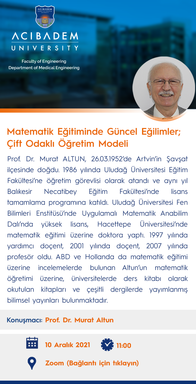 Üniversitemiz Mühendislik Fakültesi Tıp Mühendisliği Bölümü tarafından düzenlenen “Matematik Eğitiminde Güncel Eğilimler: Çift Odaklı Öğretim Modeli” başlıklı etkinlik, 10 Aralık 2021 tarihinde Prof. Dr. Murat Altun’un katılımıyla gerçekleşti.