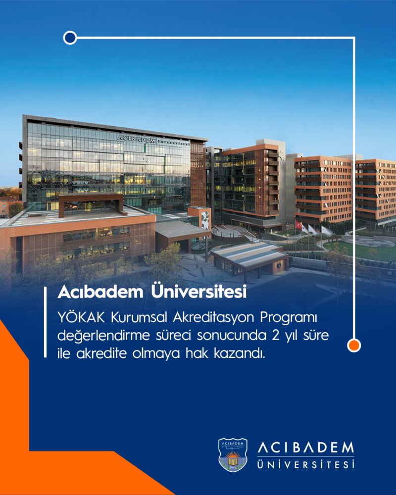 Acıbadem Üniversitesi, 01–03 Aralık 2025 tarihleri arasında Yükseköğretim Kalite Kurulu (YÖKAK) tarafından gerçekleştirilen Kurumsal Akreditasyon Programı (KAP) değerlendirme süreci sonucunda, 11 Mart 2028 tarihine kadar 2 yıl süreyle akredite olmaya hak kazandı.