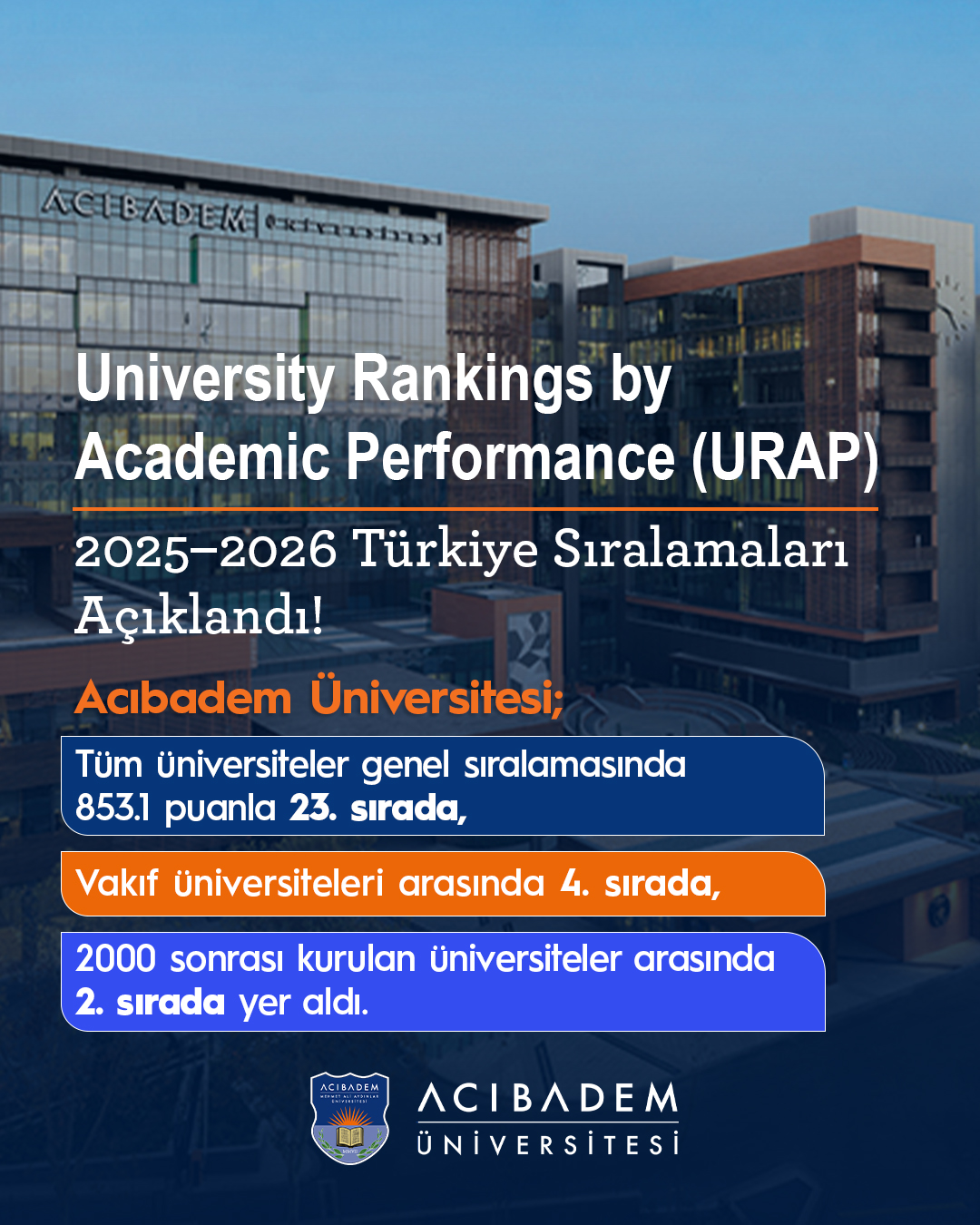 Vakıf üniversiteleri arasında 4. sırada, 2000 yılından sonra kurulan üniversiteler arasında 2. sırada yer aldı.