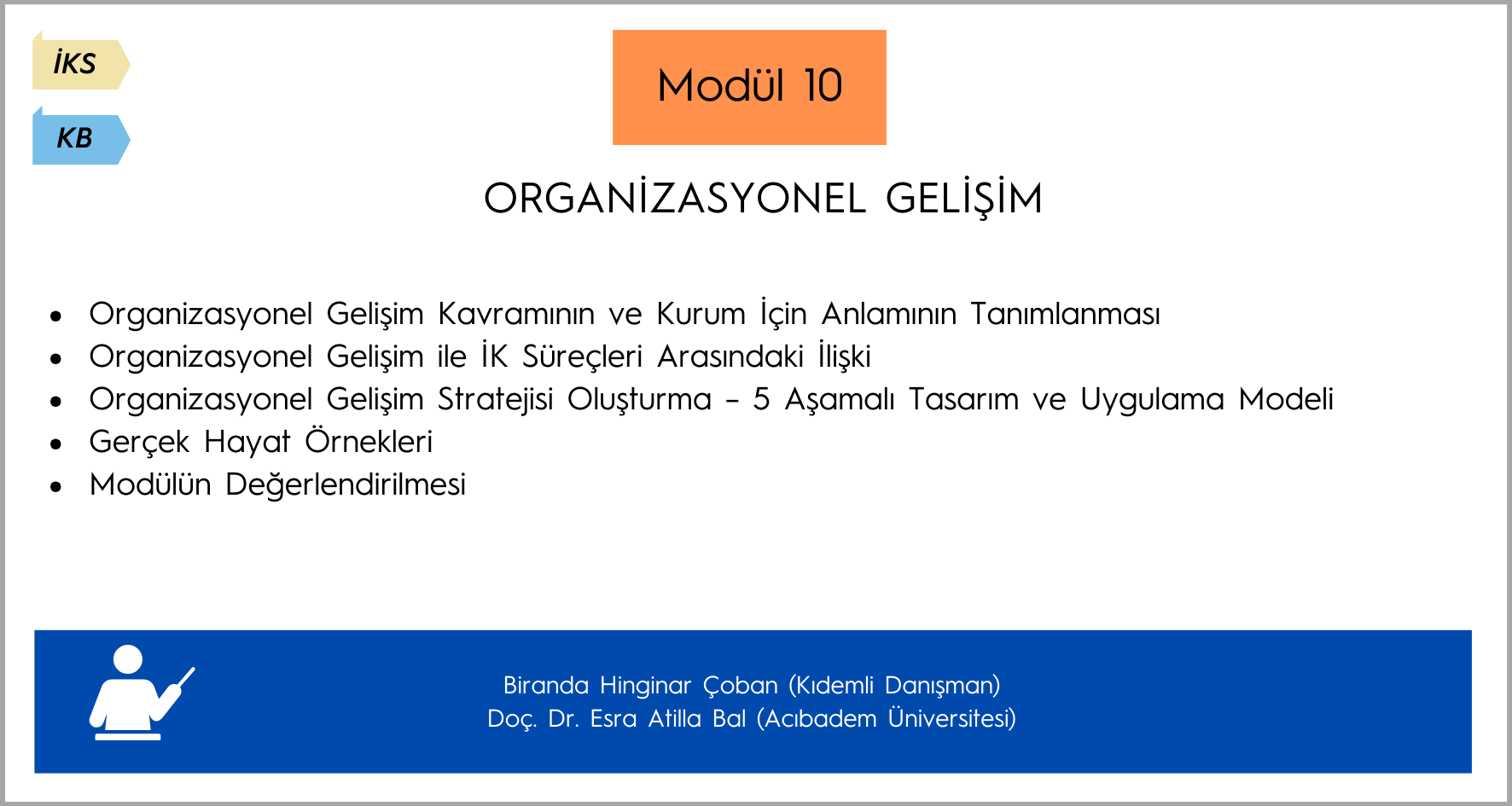 Organizasyonel Gelişim kısaca, bir kurumun verimliliğini, insan kaynakları süreç ve yapısında ve kurum kültüründe sistematik iyileştirmeler yaparak artırma ve koruma olarak tanımlanabilir. Bu modülde, katılımcılara Organizasyonel Gelişim içindeki temel kavram ve pratikler aktarılırken, gerçek hayat örnekleri üzerinden uygulama deneyimi kazanmaları sağlanması da hedeflenmektedir.